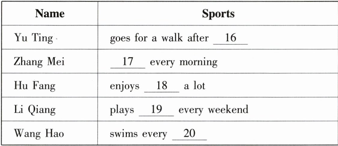 16. dinner 17. runs 18. dancing 19. basketball 20. Tuesday