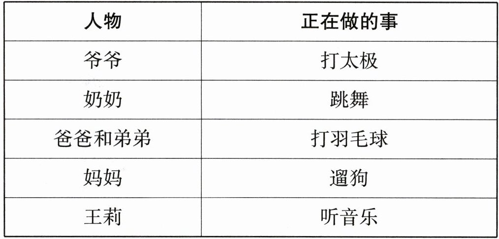 One possible version: It’s Saturday today. It’s sunny and warm. My family are in the park now. We are doing different things. My grandfather is doing Tai Chi. My grandmother is dancing to music with her friends happily. They dance here every weekend. Look! My father is playing badminton with my brother over there. My brother likes badminton very much and he wants to join the school sports club. My mother is walking our dog,Huanhuan. It is very cute,and we all love it a lot. What about me? Well,I’m listening to music by the lake.