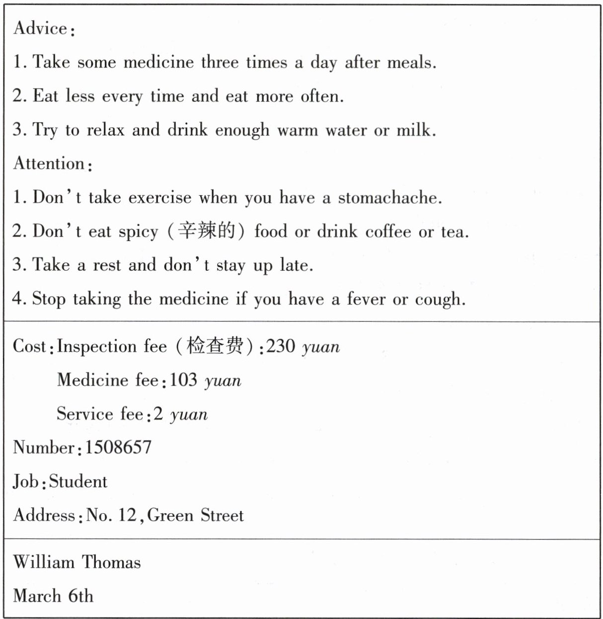 )22. According to the text,what should John do?①Don’t take exercise. ②Don’t eat spicy food. ③Drink coffee and tea. ④Take a rest.