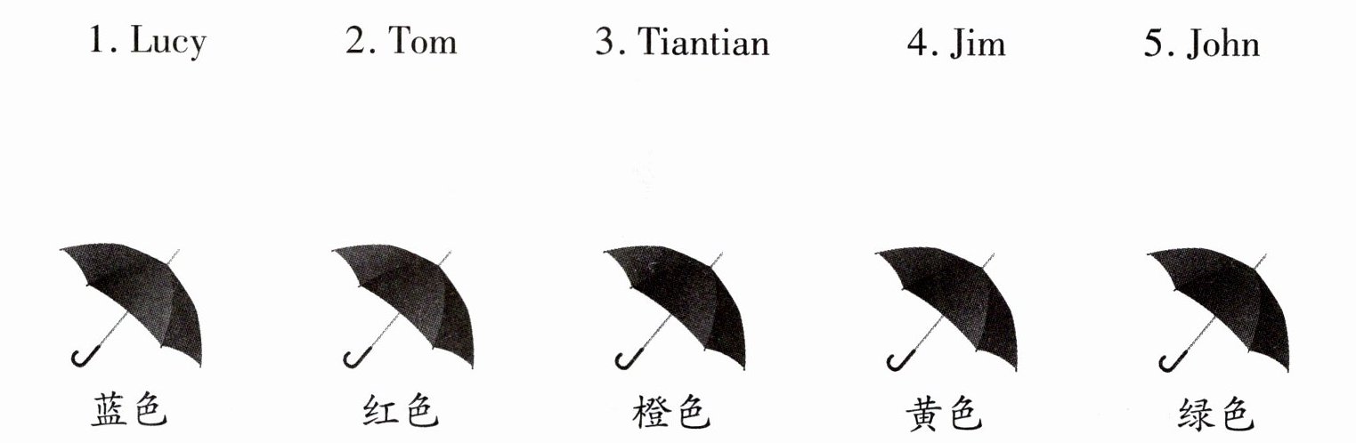 一、Listen and match. 下雨了,同学们撑着五颜六色的伞去上学。请仔细听,将人物和其对应的伞连线。