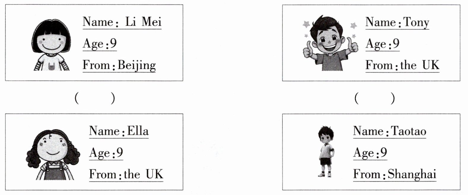 二、Listen and number. David 正在通过英语角粘贴的名片认识新同学。请你认真听一听,根据所听内容用数字 1—4 为下列名片排序。