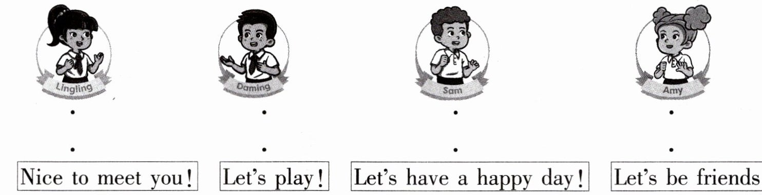 一、Listen and match. 新朋友在和我们打招呼呢!请你仔细听一听,根据所听内容将人物和对应的句子连线。