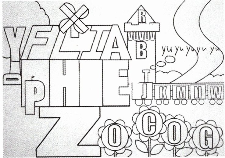 火眼金睛的你一定能发现图中隐藏的字母,请找出图中的字母并涂上你喜欢的颜色。