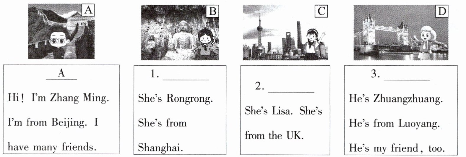 Zhang Ming 结识了新的小伙伴。请你认真读一读,为下列句子选出相应的图片,并将其序号填写在横线上。