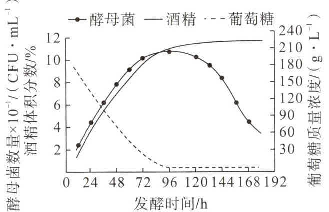 。(4) 探究原理:同学们在探究学习中发现,发酵过程中酵母菌数量、酒精体积分数和葡萄糖质量浓度不断发生变化,如图所示。