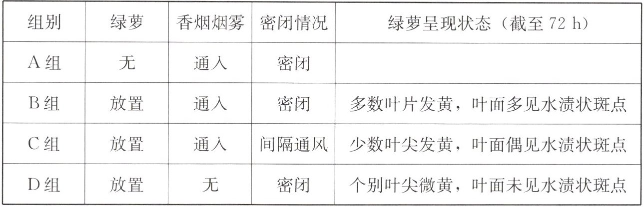 ①用玻璃制成长、宽、高均为 60 cm 的实验舱,其上方的玻璃盖可移动,以便放入绿萝。放入绿萝后,在接口处涂抹凡士林密封。实验舱一侧开有圆孔,以便通入香烟烟雾。通入烟雾后,用胶布密封圆孔。实验选用生长旺盛、长势基本一致的绿萝,通入的香烟烟雾量是由 2 支同型号香烟完全燃烧产生的。