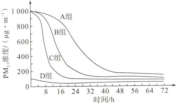 ③实验中,每 2 h 测定实验舱中 PM₂.₅浓度并记录数据。实验重复 3 次,对实验数据进行处理后绘制成如图曲线。