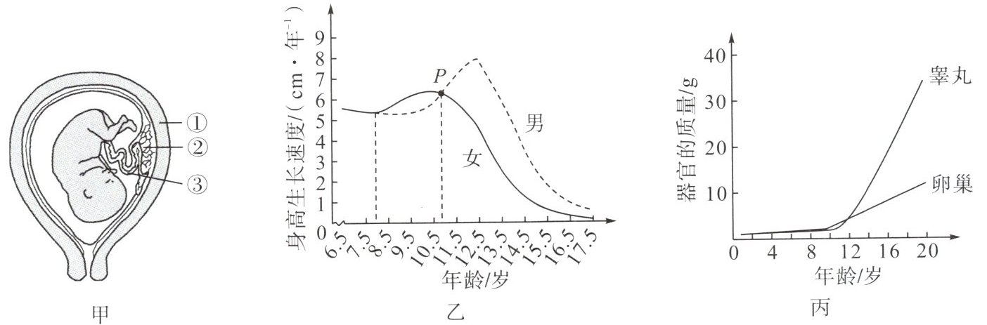 2. 图甲为胚胎在母体内发育的示意图,图乙为某地男、女生身高生长速度曲线图,图丙为睾丸和卵巢的发育趋势曲线图,请据图回答下列问题。
