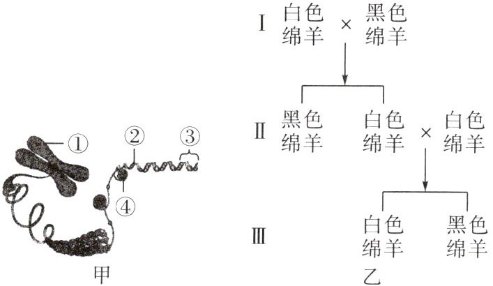 2. 图甲是染色体结构示意图,图乙是绵羊的毛色遗传图解,请据图回答下列问题。
