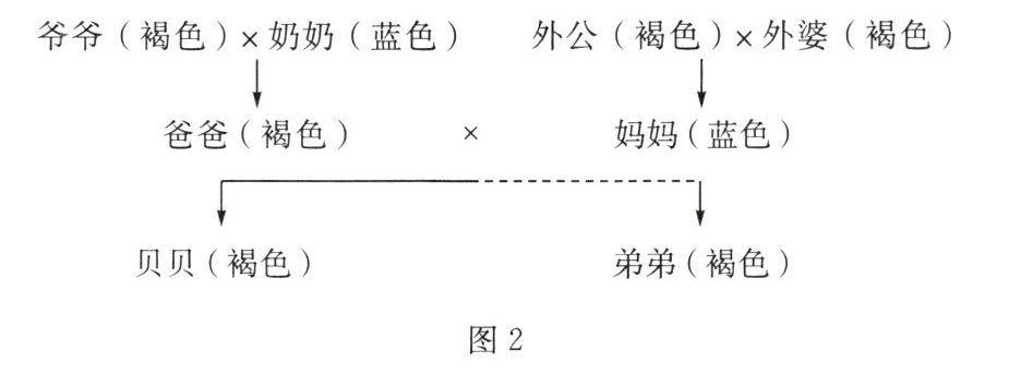 (3) 人眼的虹膜有褐色、蓝色等,贝贝对家庭成员虹膜颜色进行了调查,结果如图2所示(显性基因用A表示,隐性基因用a表示)。