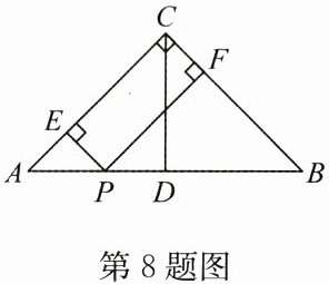 8. 如图,在 $ Rt\triangle ABC $ 中,$ \angle ACB = 90^{\circ} $,$ AC = BC = 2\sqrt{2} $,$ CD\perp AB $ 于点 $ D $。点 $ P $ 从点 $ A $ 出发,沿 $ A\rightarrow D\rightarrow C $ 的路径运动,运动到点 $ C $ 停止,过点 $ P $ 作 $ PE\perp AC $ 于点 $ E $,作 $ PF\perp BC $ 于点 $ F $。设点 $ P $ 的运动路程为 $ x $,四边形 $ CEPF $ 的面积为 $ y $,则能反映 $ y $ 与 $ x $ 之间函数关系的图象是(