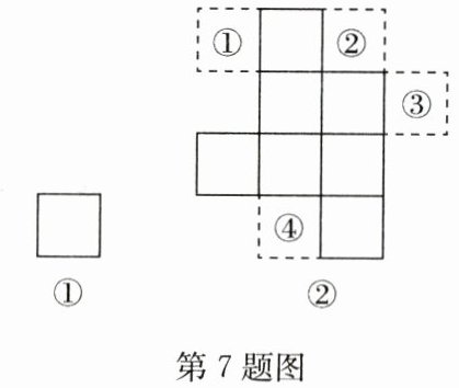 7. 图①和图②中所有的小正方形都全等,将图①的正方形放在图②中①②③④的某一位置,使它与原来 7 个小正方形组成的图形是中心对称图形,这个位置是(