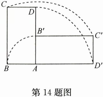 14. (8 分)如图,把一块砖 $ ABCD $ 直立于地面上,然后将其轻轻推倒。在这个过程中,点 $ A $ 保持不动,四边形 $ ABCD $ 旋转到 $ AB'C'D' $ 位置。
