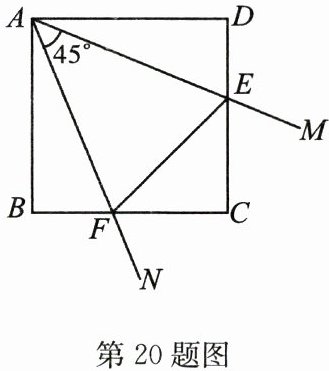 20. (11 分)如图,过正方形 $ ABCD $ 的顶点 $ A $ 作射线 $ AM $ 交 $ DC $ 于点 $ E $,将 $ AM $ 绕点 $ A $ 顺时针旋转 $ 45 ^ { \circ } $ 到射线 $ AN $ 的位置,$ AN $ 交 $ BC $ 于点 $ F $,连接 $ EF $。