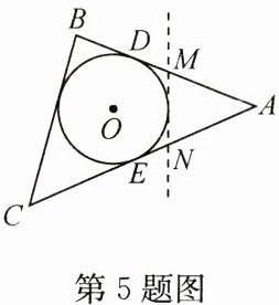 5. 如图,$\odot O$ 是$\triangle ABC$ 的内切圆,点 $D$、$E$ 是其中的两个切点,已知 $AD = 6$ cm,小明准备用剪刀沿着与$\odot O$ 相切的一条直线 $MN$ 剪下一块三角形($\triangle AMN$),则剪下的$\triangle AMN$ 的周长是 (