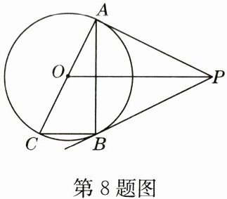 8. 如图,$PA$,$PB分别切圆O于点A$,$B$,$AC是\odot O$的直径,连接$AB$,$BC$,$OP$,则与$\angle APO$相等的角的个数是(