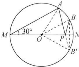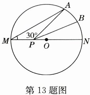 13. 如图,$MN$是半径为 1 的$\odot O$的直径,点$A在\odot O$上,$\angle AMN = 30^{\circ}$,$B为\overset{\frown}{AN}$的中点,$P是直径MN$上一动点,则$PA + PB$的最小值为______.