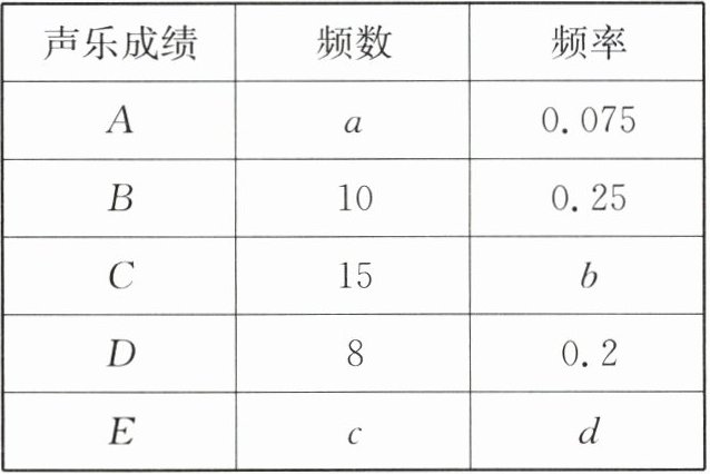 (1)此考场的考生人数为$\frac{10}{0.25}=40$,则$a=40× 0.075=3$,$b=\frac{15}{40}=0.375$,$c=40-3-10-15-8=4$,$d=\frac{4}{40}=0.1$,器乐考试中A等级的有3人