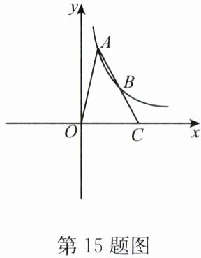 15. (10 分)如图,A、B 是双曲线 $ y = \frac{k}{x}(k \neq 0) $ 上的点,点 A 的坐标是 $ (1,4) $,B 是线段 AC 的中点。