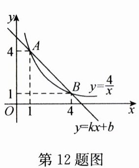 12. 如图,在平面直角坐标系中,一次函数 $ y = kx + b $ 和反比例函数 $ y = \frac{4}{x}(x > 0) $ 的图象交于 $ A $、$ B $ 两点,则可利用函数图象得到不等式 $ \frac{4}{x} < kx + b(x > 0) $ 的解集是