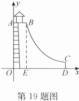 19. (11 分)如图为某公园“水上滑梯”的侧面图,其中 $ BC $ 段可看成是一段双曲线,矩形 $ AOEB $ 为向上攀爬的梯子,$ OA = 5 $ 米,进口 $ AB // OD $,且 $ AB = 2 $ 米,出口 $ C $ 点距水面的距离 $ CD = 1 $ 米,求 $ B $、$ C $ 之间的水平距离 $ DE $ 的长度.