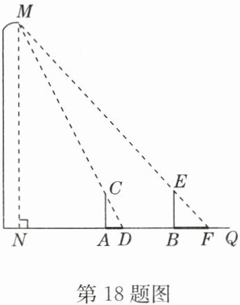 18. (13 分)晚饭后,小聪和小军在社区广场散步,小聪问小军:“你有多高?”小军一时语塞. 小聪思考片刻,提议用广场照明灯下的影长及地砖长来测量小军的身高. 于是,两人在灯下沿直线$NQ$移动,如图. 当小聪正好站在广场的$A$点(距$N$点 5 块地砖长)时,其影长$AD$恰好为 1 块地砖长;当小军正好站在广场的$B$点(距$N$点 9 块地砖长)时,其影长$BF$恰好为 2 块地砖长. 已知广场地面由边长为 0.8 米的正方形地砖铺成,小聪的身高$AC$为 1.6 米,$MN \perp NQ$,$AC \perp NQ$,$BE \perp NQ$. 请你根据以上信息,求出小军身高$BE$的长(结果精确到 0.01 米).