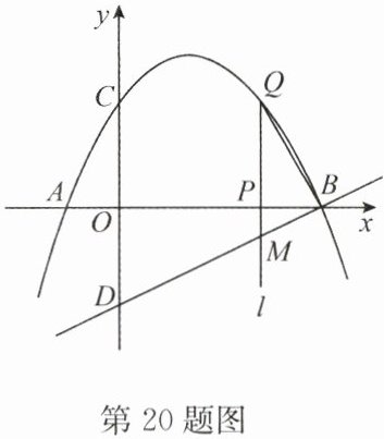20. (14 分)如图,已知抛物线经过点$A(-1,0)$,$B(4,0)$,$C(0,2)$三点,点$D与点C关于x$轴对称,点$P是x$轴上的一个动点,设点$P的坐标为(m,0)$,过点$P作x轴的垂线l交抛物线于点Q$,交直线$BD于点M$,连接$QB$.