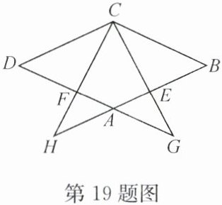 19. (14 分)如图,在菱形$ABCD$中,点$E$、$F分别在边AB$、$AD$上,$BE = DF$,$CE的延长线交DA的延长线于点G$,$CF的延长线交BA的延长线于点H$.