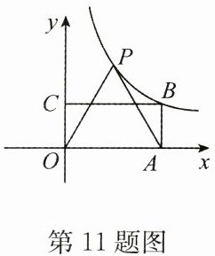 11. 如图,矩形 $ OABC $ 的顶点 $ A $、$ C $ 分别在 $ x $ 轴,$ y $ 轴上,顶点 $ B $ 在第一象限,$ AB = 1 $,将线段 $ OA $ 绕点 $ O $ 按逆时针方向旋转 $ 60^{\circ} $ 得到线段 $ OP $,连接 $ AP $. 若反比例函数 $ y = \frac{k}{x}(k \neq 0) $ 的图象经过 $ P $,$ B $ 两点,则 $ k $ 的值为______.