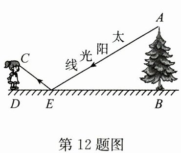12. 为了测量校园水平地面上一棵不可攀爬的树的高度,小文同学做了如下的探索:根据物理学中光的反射定律,利用一面镜子和一根皮尺,设计如图所示的测量方案:把一面很小的镜子放在合适的位置,刚好能在镜子里看到树梢顶点,此时小文与平面镜的水平距离为 2.0 米,树的底部与平面镜的水平距离为 8.0 米. 若小文的眼睛与地面的距离为 1.6 米,则树的高度为