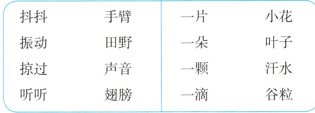 二、抖抖—手臂 振动—翅膀 掠过—田野 听听—声音 一片—叶子 一朵—小花 一颗—谷粒 一滴—汗水