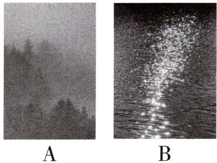 1.正 也 2.波光闪动的样子 B 隐隐约约的样子 A
