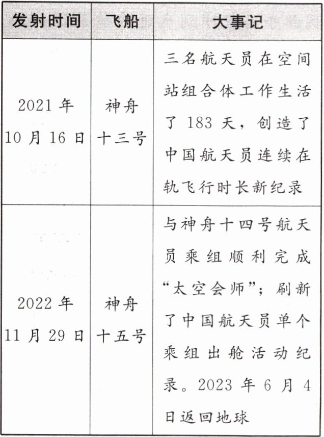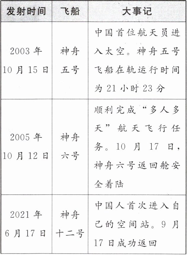 (1)①航天飞船发射的时间间隔越来越短;②航天员在太空驻留的时间越来越长;③进入太空的航天员人数越来越多;④太空探究的领域越来越广。(2)示例:神舟十六号载人飞船发射取得圆满成功