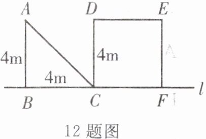 12. 如图,等腰直角三角形 $ ABC $ 以 $ 2 \mathrm { m } / \mathrm { s } $ 的速度沿直线 $ l $ 向正方形移动,直到 $ AB $ 与 $ CD $ 重合,设 $ x \mathrm { s } $ 时,等腰直角三角形 $ ABC $ 与正方形 $ DEFC $ 重叠部分的面积为 $ y \mathrm { m } ^ { 2 } $。