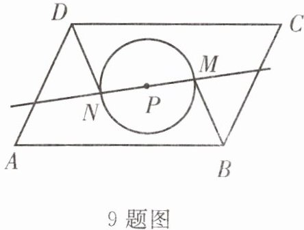 9. 如图,点 P 为$□ ABCD$的对称中心,以点 P 为圆心作圆,过点 P 的任意直线与圆相交于点 M,N,请你判断线段 BM,DN 的大小关系,并说明理由。