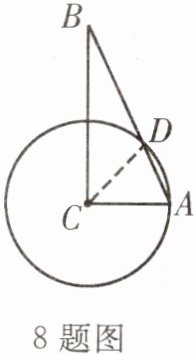 8. 如图,已知在$\triangle ABC$中,$∠ACB = 90^{\circ}$,$∠B = 25^{\circ}$,以点 C 为圆心,CA 长为半径的圆交 AB 于点 D,求$∠BCD$的度数。