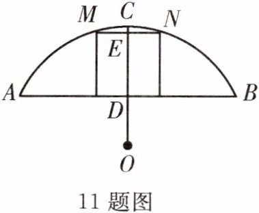 11. 如图,有一座圆弧形的拱桥(示意图),桥下水面宽度 AB 为 7.2 m,拱顶高出水平面 2.4 m,现有一艘宽为 3 m,船舱顶部为正方形并高出水平面 2 m 的货船要经过拱桥,请你判断一下,此货船能顺利通过这座拱桥吗?请说明理由。($\sqrt{2.96}\approx1.72$)