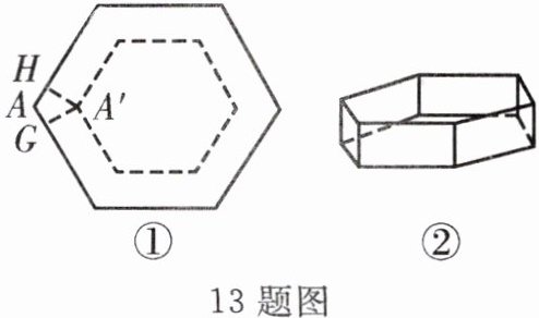 13. 将一块正六边形硬纸片(图①)做成一个底面仍为正六边形且高相等的无盖纸盒(侧面均垂直于底面,见图②),需在每一个顶点处剪去一个四边形,例如图中的四边形$AGA'H$,$\angle GA'H$的度数是______。