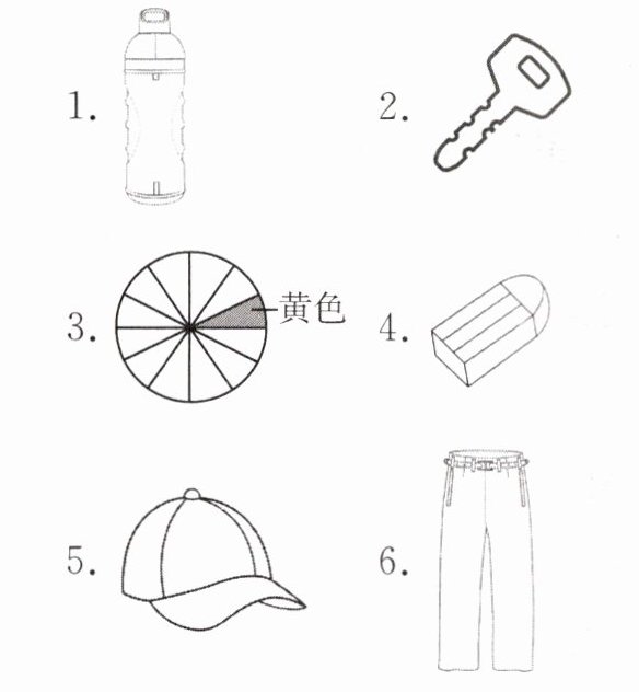 1. bottle 2. key 3. yellow 4. eraser 5. cap 6. trousers