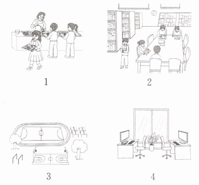 1. sports field 2. dining halls 3. office building 4. across from 5. in front of