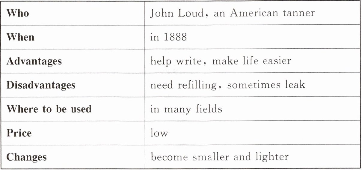 One possible version: Ballpoint Pens We know that the ballpoint pen is one of the most useful inventions. It was invented by an American tanner named John Loud in 1888. It really helps us write faster and makes our life easier. But sometimes the ballpoint pens leak and they need refilling. They are widely used in many fields. And the price is usually low. Ballpoint pens are becoming smaller and lighter. They are really useful in our life.
