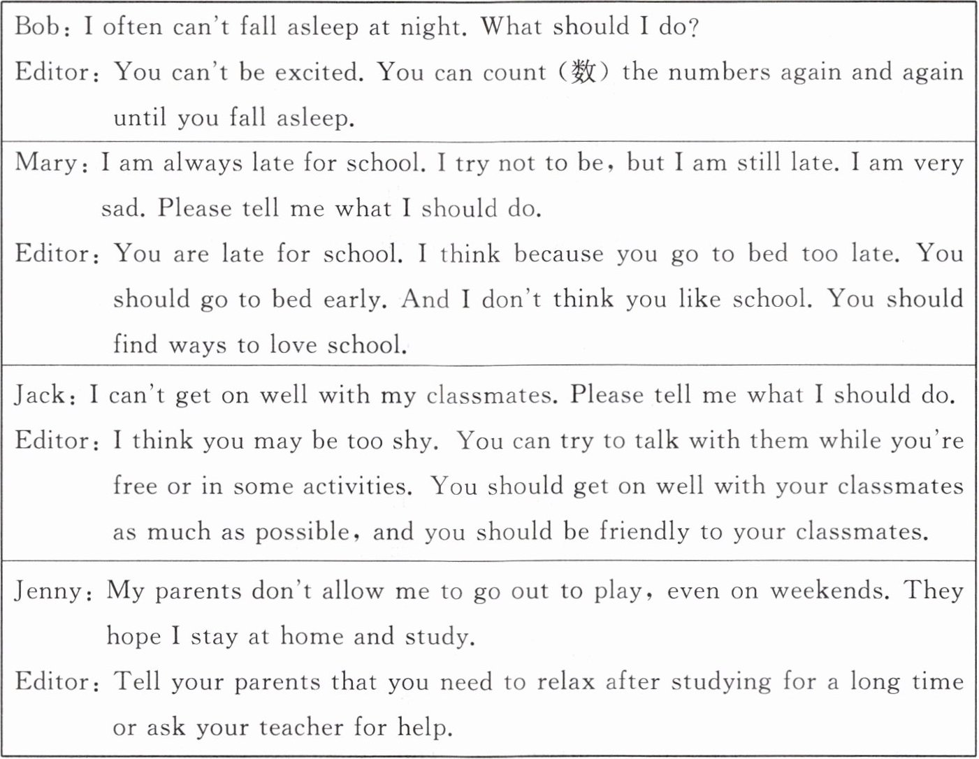 You must meet with some unpleasant things in your life, and you don’t know how to work them out. Now you can find the advice column(栏) in the magazine. Here are some problems and advice.