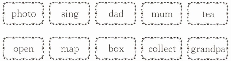 物品类:photo tea map box 动作类:sing open collect 家庭成员类:dad mum grandpa