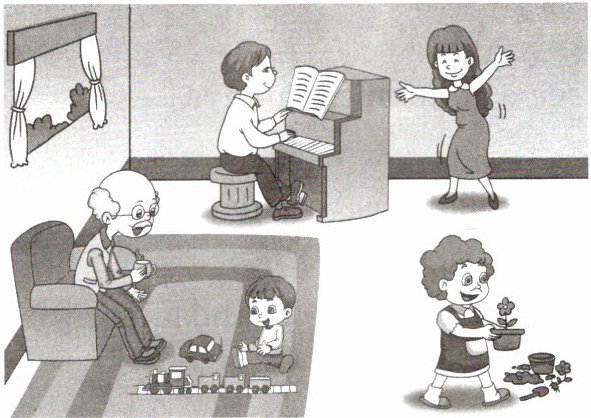 Look at this photo. In this photo, my father is playing the piano. That is his hobby. My mother's hobby is dancing. She is dancing with the music now. My grandpa's hobby is drinking Chinese tea. Now he is drinking Chinese tea in the sofa. My grandma likes planting flowers. My hobby is collecting toy cars. Look, these are my toy cars on the floor.