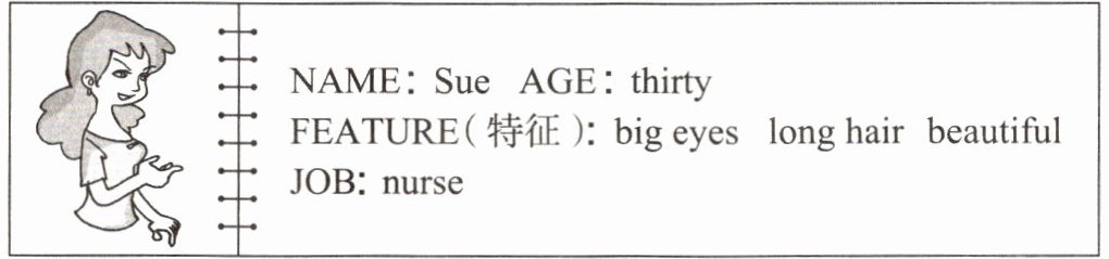 Look at this picture. She is my aunt. Her name is Sue. She is thirty. She has big eyes. She has long hair. She is beautiful. She is a nurse.