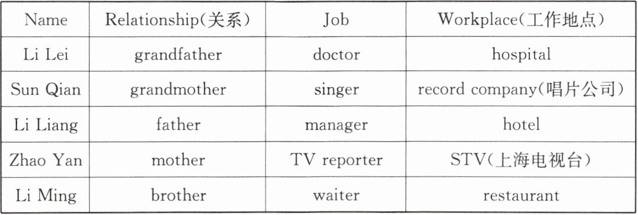 | Name | Relationship(关系) | Job | Workplace(工作地点) |