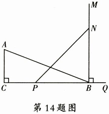 14. 如图,CA⊥BC,垂足为C,AC=2cm,BC=6cm,射线BM⊥BQ,垂足为B.动点P从C点出发以1cm/s的速度沿射线CQ运动,点N为射线BM上一动点,随着P点运动而运动,且满足PN=AB,当点P运动