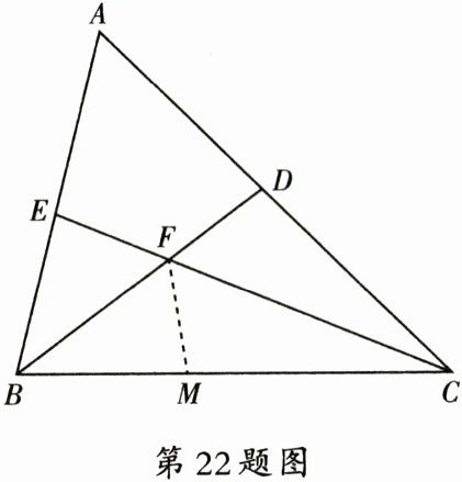 22. (8分)如图,在$△ABC$中,$∠A=60^{\circ },BD,CE$是$△ABC$的两条角平分线,且$BD,CE$交于点$F$,用等式表示$BE,BC,CD$这三条线段之间的数量关系,并证明你的结论;