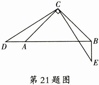 21. (8分)如图,在等腰直角$△ABC$中,$CA=CB,∠ACB=90^{\circ },∠CAB=∠CBA=45^{\circ }$.点$D$在$BA$的延长线上,连接$CD$;过点$C$作$CE⊥CD$,使$CE=CD$,连接$BE$,