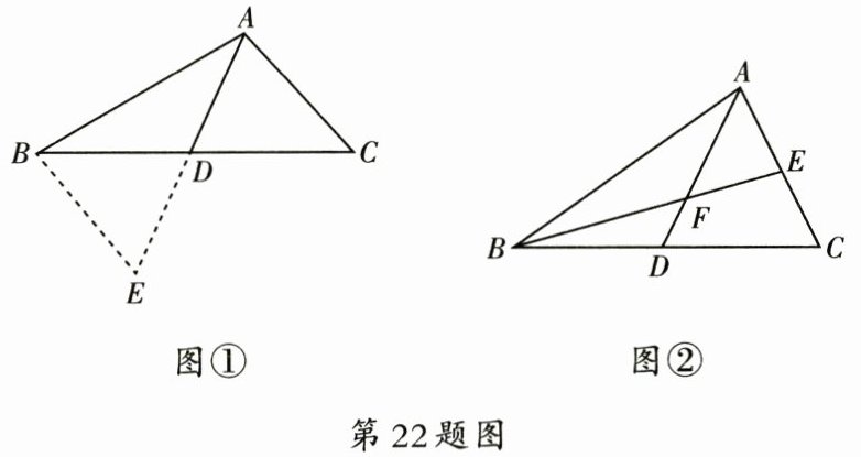 22. 陈红遇到这样一个问题: 如图①, 在 $ \triangle ABC $ 中, $ AB = 12 $, $ AC = 8 $, $ AD $ 是中线, 求 $ AD $ 的取值范围. 她的做法是: 过点 $ B $ 作 $ BE // AC $ 交 $ AD $ 的延长线于点 $ E $, 证明 $ \triangle BED \cong \triangle CAD $, 经过推理和计算就可以使问题得到解决.